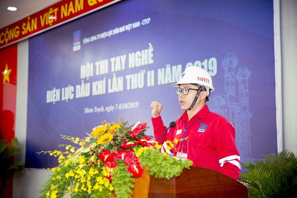 Anh Trần Văn Hoàng, Vận hành viên NMĐ Nhơn Trạch 2, đại diện cho các thí sinh tham gia Hội thi thể hiện quyết tâm thi đấu trung thực, tự tin, sáng tạo.