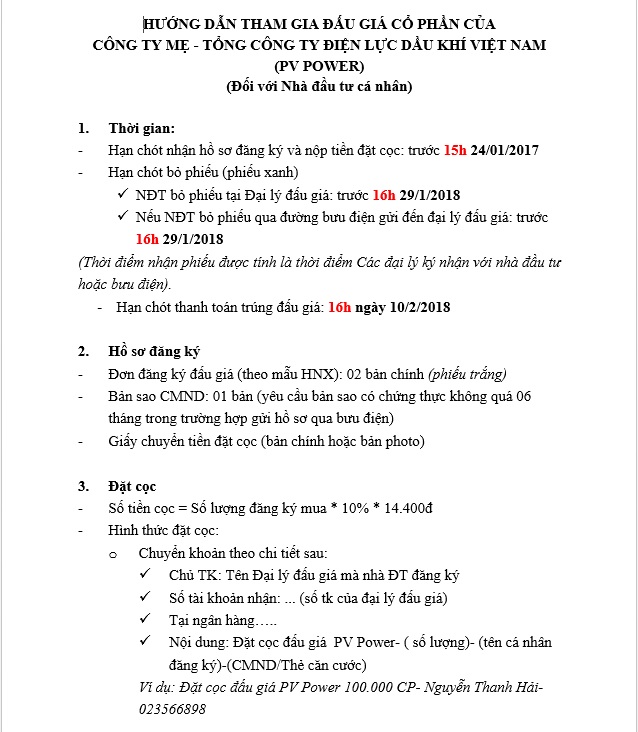 HƯỚNG DẪN THAM GIA ĐẤU GIÁ CỔ PHẦN CỦA CÔNG TY MẸ - TỔNG CÔNG TY ĐIỆN LỰC DẦU KHÍ VIỆT NAM (PV POWER) (Đối với Nhà đầu tư cá nhân)