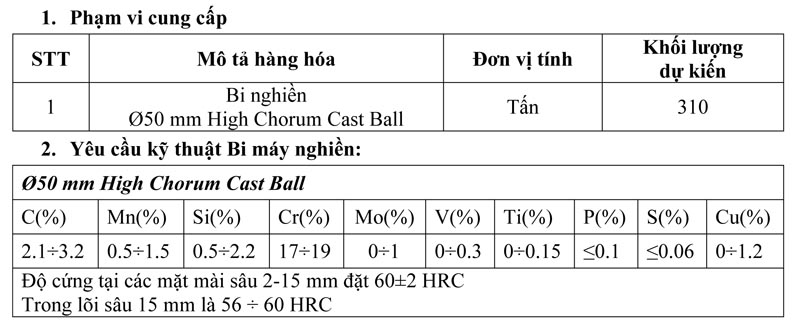 Tổng Công ty Điện lực Dầu khí Việt Nam – CTCP (PV Power) có nhu cầu mua sắm Tổng công ty triển khai mua sắm bi nghiền phục vụ vận hành NMĐ Vũng Áng 1 năm 2022 với phạm vi công việc như sau: