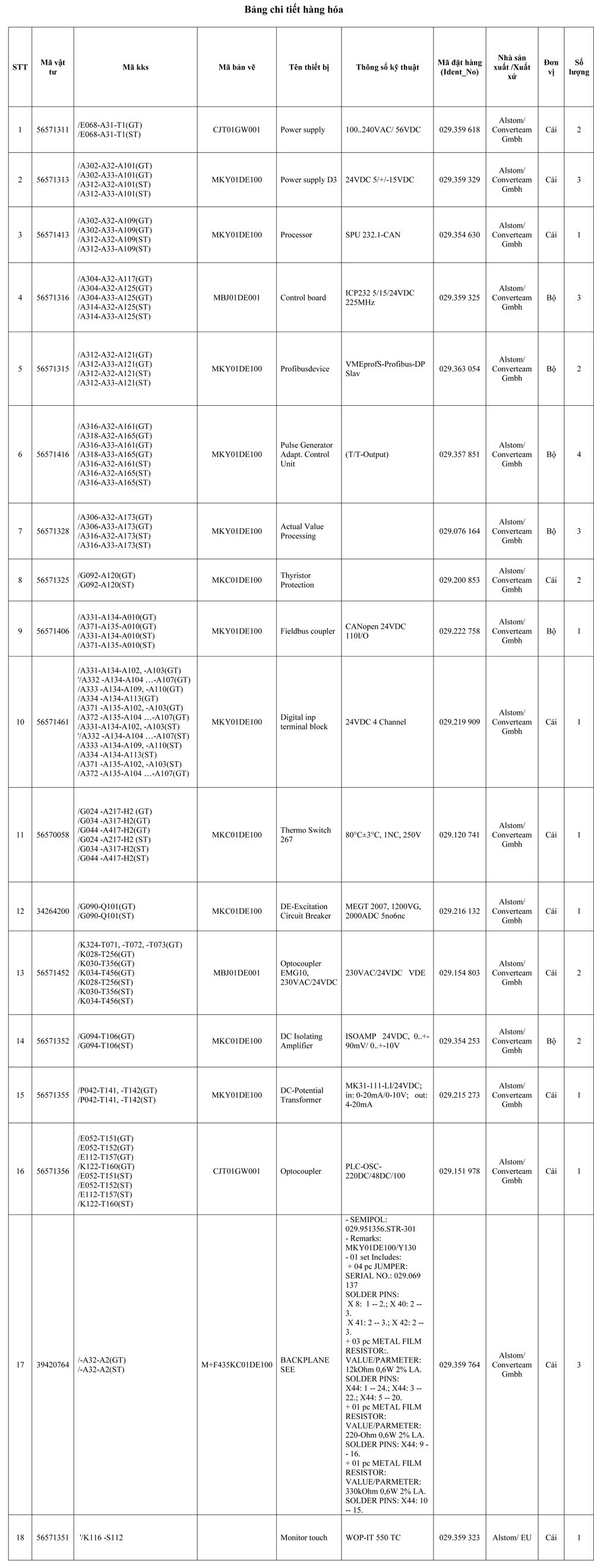Bảng chi tiết hàng hóa