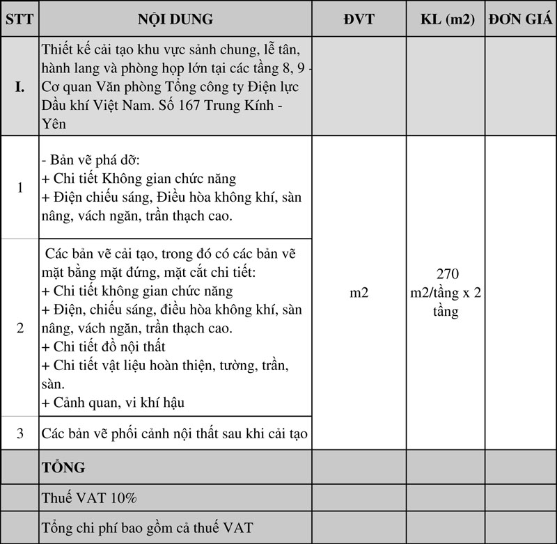 Tổng công ty Điện lực Dầu khí Việt Nam - CTCP có nhu cầu thiết kế cải tạo khu vực sảnh chung, lễ tân, hành lang và phòng họp lớn tại các tầng 8, 9 với nội dung sau: