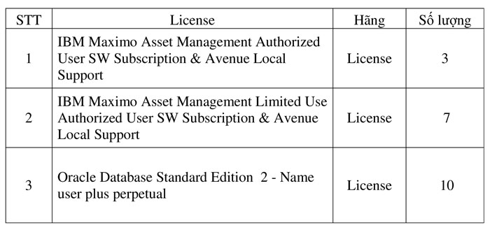 Hiện nay PV Power đang có nhu cầu về dịch vụ gia hạn bản quyền phần mềm IBM Maximo và Oracle phục vụ hệ thống CMMS nhà máy điện Vũng Áng 1 với các nội dung cụ thể như sau: