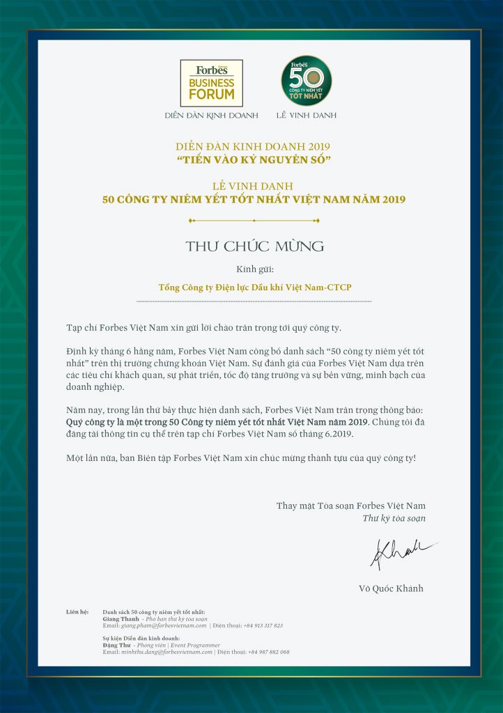 Ngày 3/6/2019, Forbes Việt Nam đã công bố “Danh sách 50 công ty niêm yết tốt nhất” năm 2019, Tổng Công ty Điện lực Dầu khí Việt Nam - CTCP (PV Power) lần đầu tiên vinh dự lọt vào danh sách này.