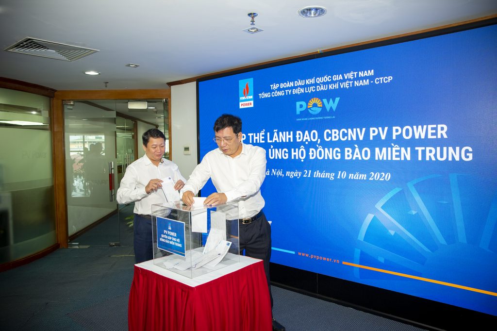 Đồng cảm với những mất mát của đồng bào miền Trung, PV Power đã tổ chức kêu gọi quyên góp ủng hộ và tiến hành thăm hỏi, động viên các tỉnh gặp thiên tai. Các cán bộ, người lao động trong toàn Tổng công ty đã hưởng ứng lời kêu gọi bằng nhiều hình thức. Chỉ trong ngày 21/10, CBCNV PV Power đã quyên góp, dành gần 600 triệu đồng để ủng hộ các địa phương khắc phục hậu quả thiên tai.