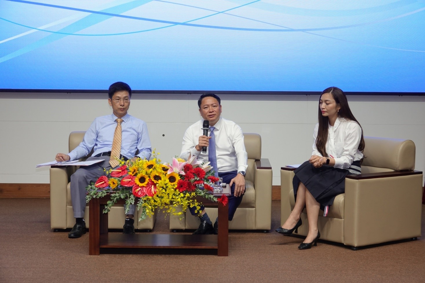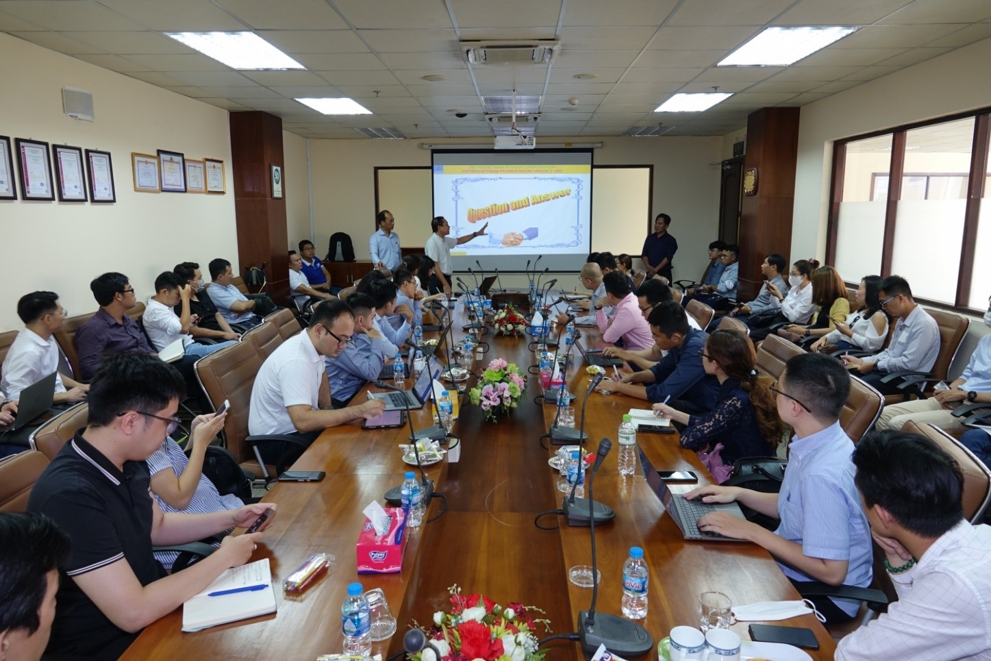 Ông Nguyễn Duy Giang - Phó Tổng giám đốc PV Power (giữa) và ông Nguyễn Đình Thi - Trưởng ban KTKH PV Power (bên trái) đối thoại với các nhà đầu tư