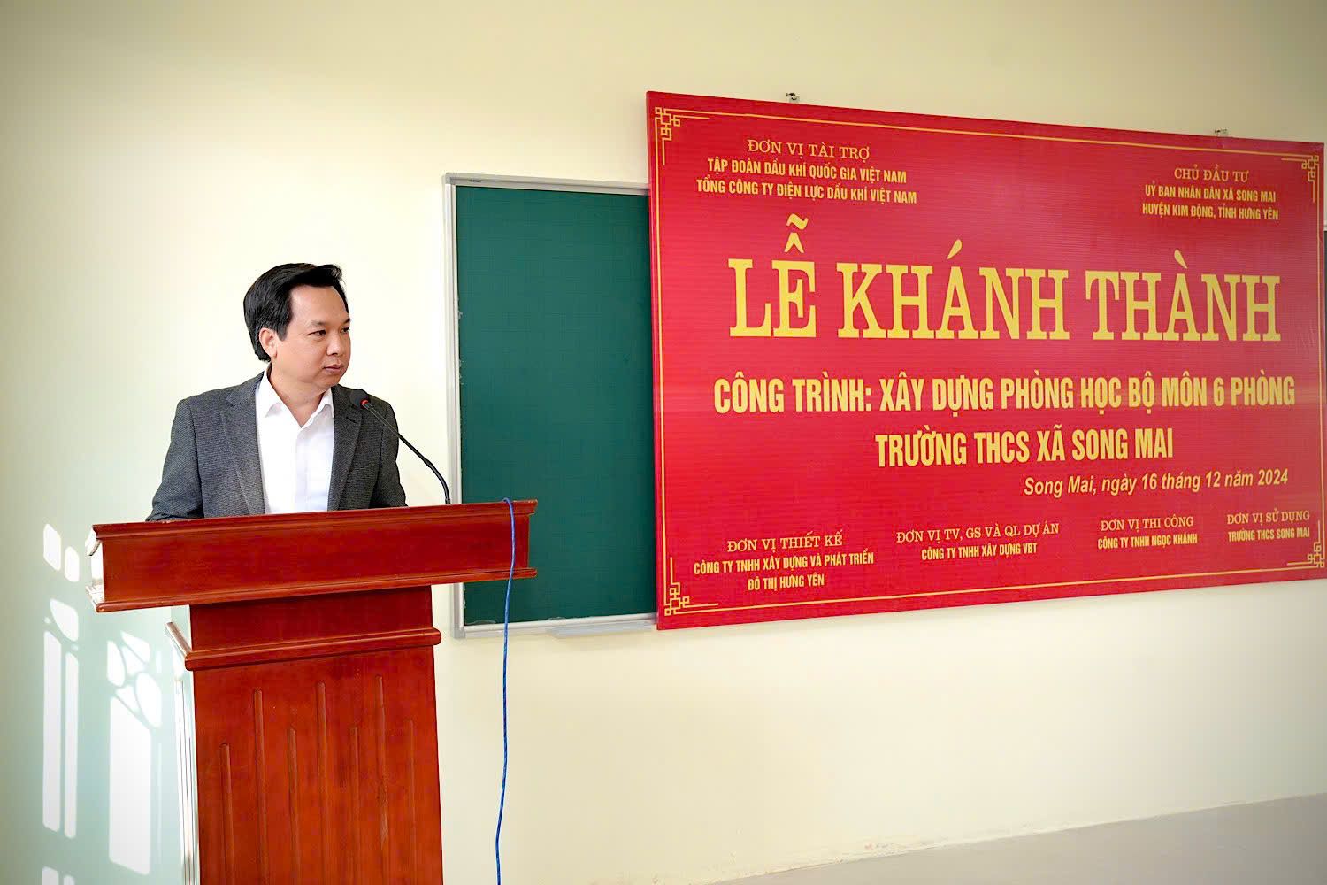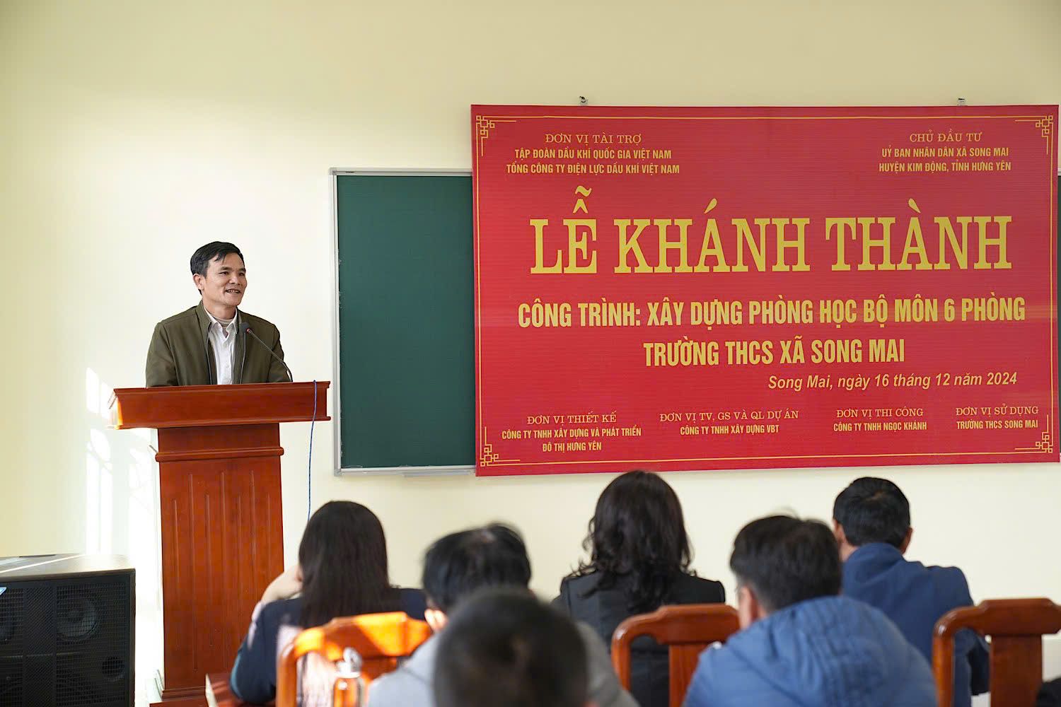 Báo cáo tóm tắt về quá trình xây dựng công trình, Ông Hà Văn Hài, Chủ tịch UBND xã Song Mai cho biết: Công trình Xây dựng phòng học cho Trường THCS xã Song Mai, huyện Kim Động, tỉnh Hưng Yên được khởi công xây dựng từ ngày 30/11/2023 và hoàn thành đưa vào sử dụng ngày 16/12/2024 với khối nhà 3 tầng 6 phòng họp có tổng diện tích 1.013m2. Công trình được trang bị đầy đủ hệ thống cấp điện, chiếu sáng, cửa sổ, cửa ra vào kiên cố, hệ thống chống sét, trang thiết bị phòng cháy chữa cháy... với tổng kinh phí đầu tư xây dựng 9,5 tỷ đồng, trong đó PV Power tài trợ 5 tỷ đồng. Sau 2 năm thi công, công trình đã hoàn thành đạt yêu cầu kỹ thuật, chất lượng và đưa vào sử dụng tháng 12 năm 2024.
