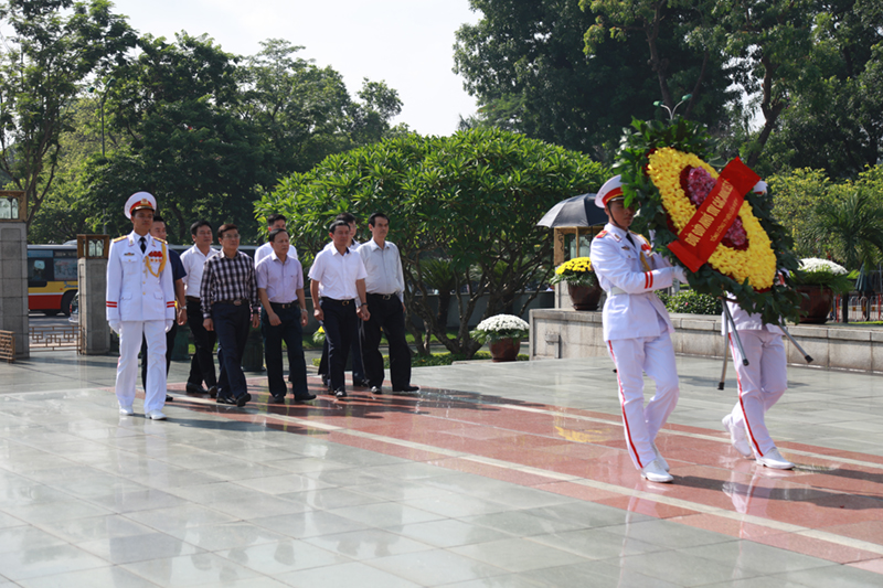 Đoàn đã dành một phút tưởng niệm các anh hùng Liệt sỹ ngã xuống vì nền hoà bình, độc lập của Tổ quốc. Tiếp đó, đoàn đã đến thắp hương và báo công với Bác tại ngôi nhà 67, nơi bác trút hơi thở cuối cùng.