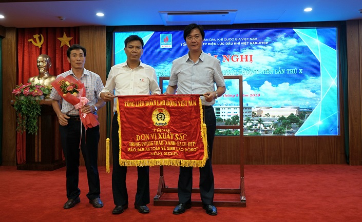 Ông Nguyễn Mạnh Kha - Phó Chủ tịch Công đoàn Dầu khí Việt Nam tặng cờ cho Công ty CP Điện lực Dầu khí Nhơn Trạch 2 là đơn vị xuất sắc trong phong trào xanh- Sạch – Đẹp, bảo đảm an toàn vệ sinh lao động năm 2018 của Tổng liên đoàn Lao động Việt Nam.