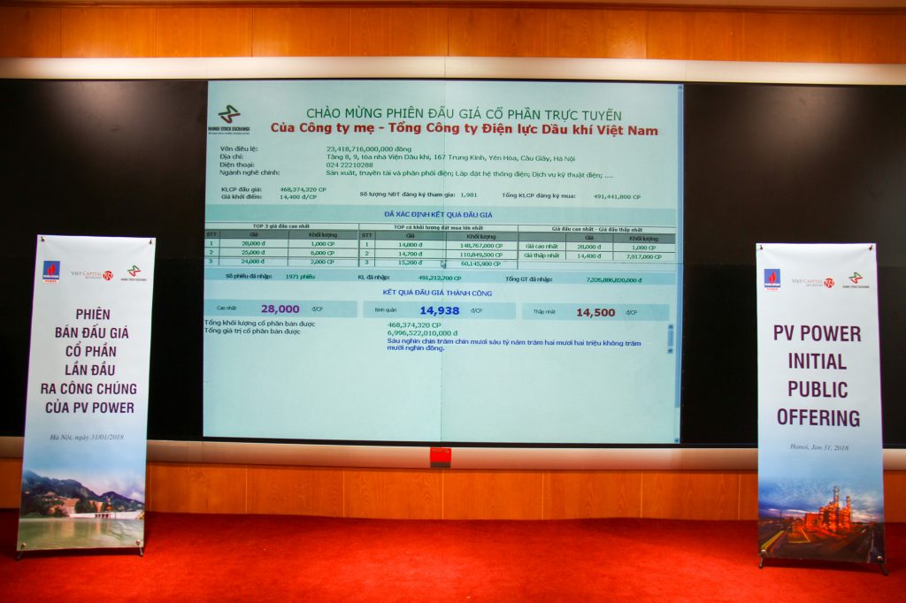 Sáng ngày 31/01/2018, phiên bán đấu giá cổ phần lần đầu ra công chúng (IPO) của Tổng công ty Điện lực Dầu khí Việt Nam (PV Power) đã được tổ chức thành công tại Sở Giao dịch Chứng khoán Hà Nội với giá bình quân là 14.938 đồng/cổ phần.