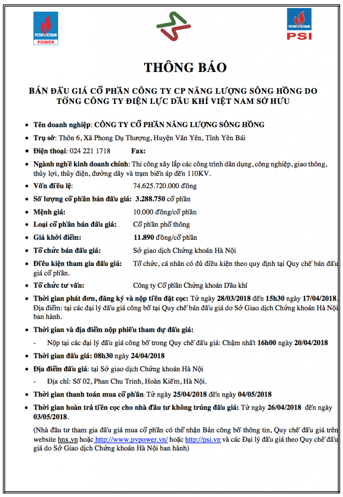 Thông báo đấu giá bán cổ phần của Công ty Cổ phần Năng lượng Sông Hồng do Tổng Công ty Điện lực Dầu khí Việt Nam sở hữu