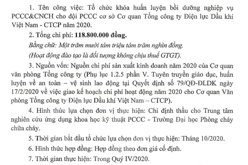 Thông báo phê duyệt kế hoạch lựa chọn đơn vị tổ chức khóa huấn luyện bồi dưỡng nghiệp vụ PCCC&CNCH cho đội PCCC cơ sở Cơ quan Tổng công ty Điện lực Dầu khí Việt Nam - CTCP năm 2020