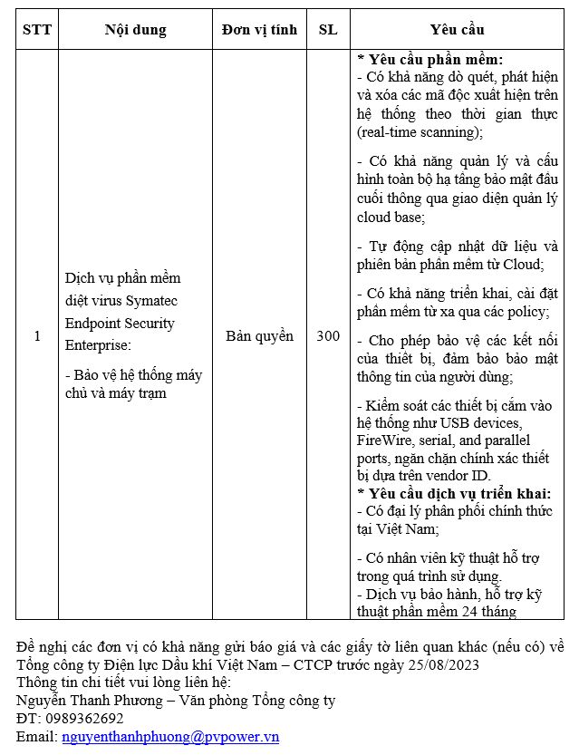 Tổng công ty Điện lực Dầu khí Việt Nam – CTCP đang có nhu cầu như sau: