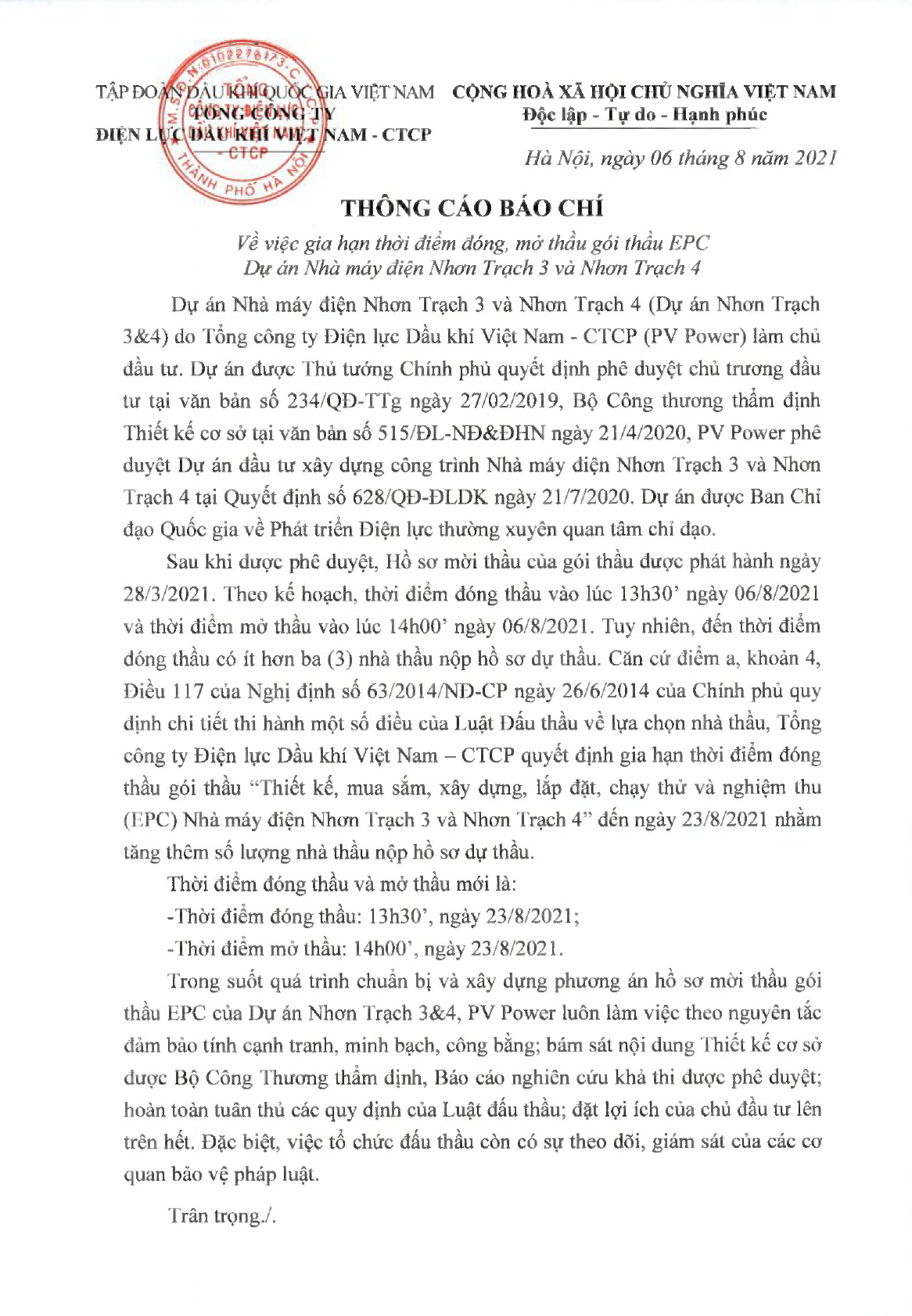 THÔNG CÁO BÁO CHÍ: Về việc gia hạn thời điểm đóng, mở thầu gói thầu EPC Dự án Nhà máy điện Nhơn Trạch 3 và Nhơn Trạch 4