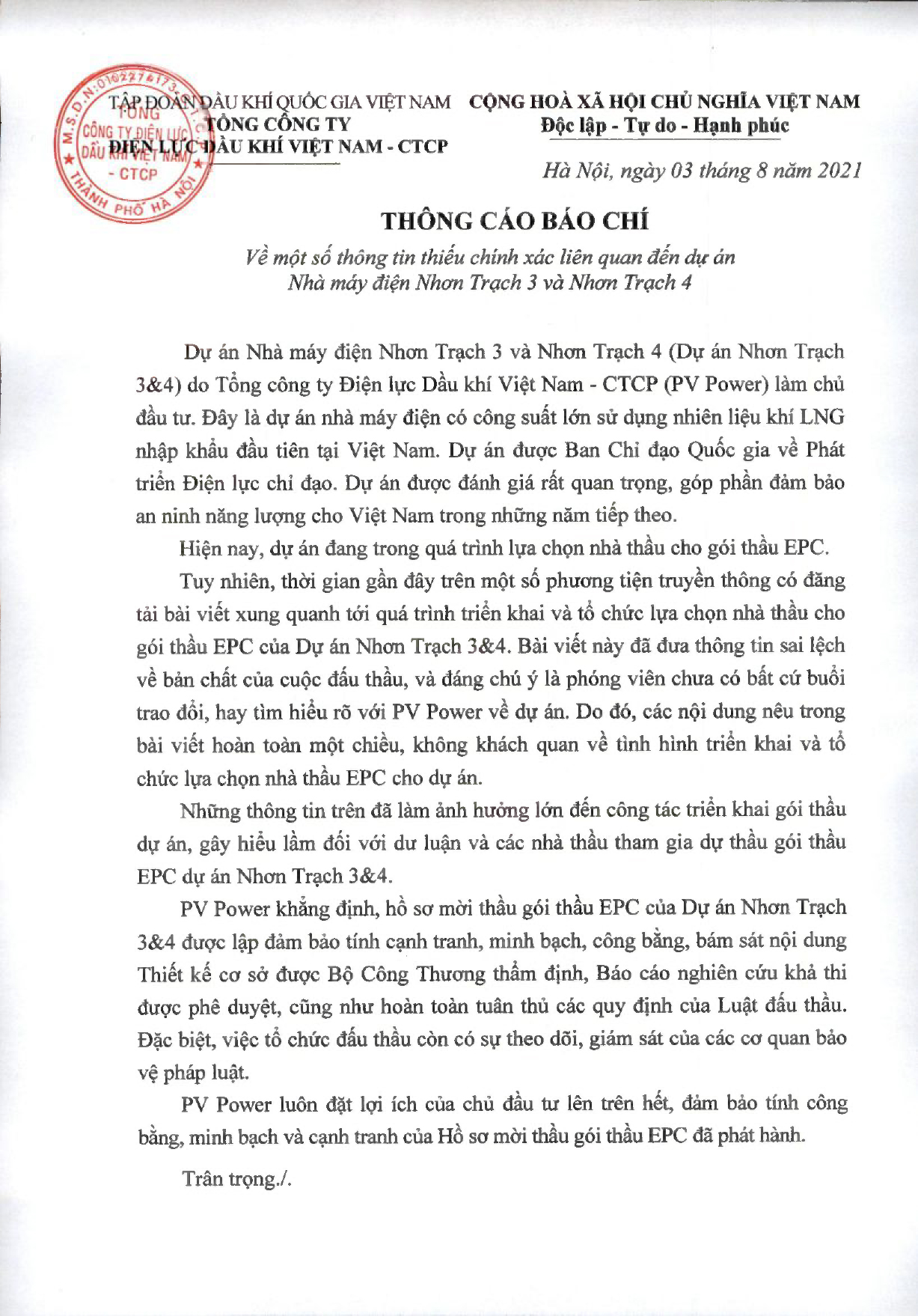 Thông cáo báo chí về một số thông tin thiếu chính xác liên quan đến dự án Nhà máy điện Nhơn Trạch 3 và Nhơn Trạch 4