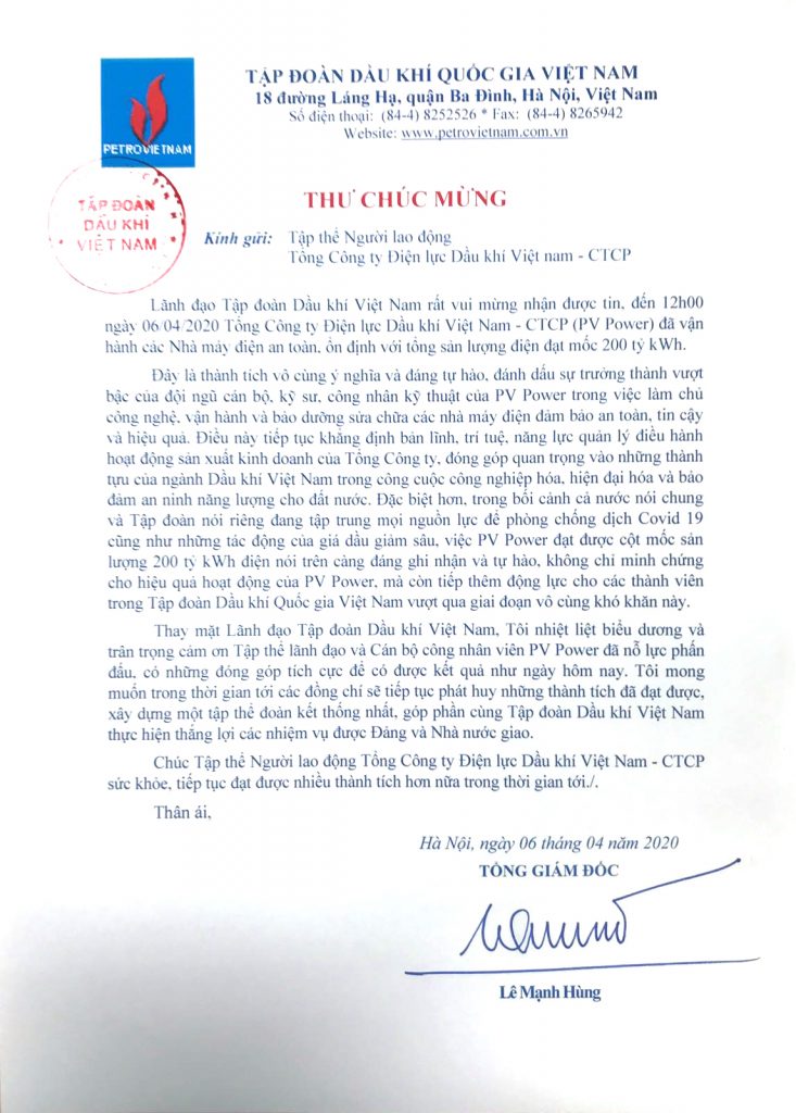 Lãnh đạo Tập đoàn Dầu khí Việt Nam (PVN) rất vui mừng khi nhận được thông tin Tổng công ty Điện lực Dầu khí Việt Nam - CTCP (PV Power) đạt mốc sản lượng 200 tỷ kWh. Nhân dịp này, Tổng giám đốc PVN Lê Mạnh Hùng đã gửi thư chúc mừng đến tập thể người lao