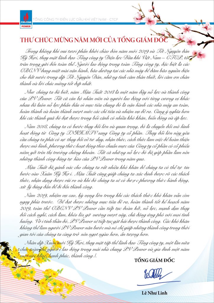 Thứ năm, 31/01/2019 | 10:00 THƯ CHÚC MỪNG NĂM MỚI CỦA TỔNG GIÁM ĐỐC PV POWER Thư chúc mừng năm mới của Tổng giám đốc PV Power THƯ CHÚC MỪNG NĂM MỚI CỦA TỔNG GIÁM ĐỐC PV POWER ; Từ khóa: Tin tức - Sự kiện Hoạt động PV Power Mặc định