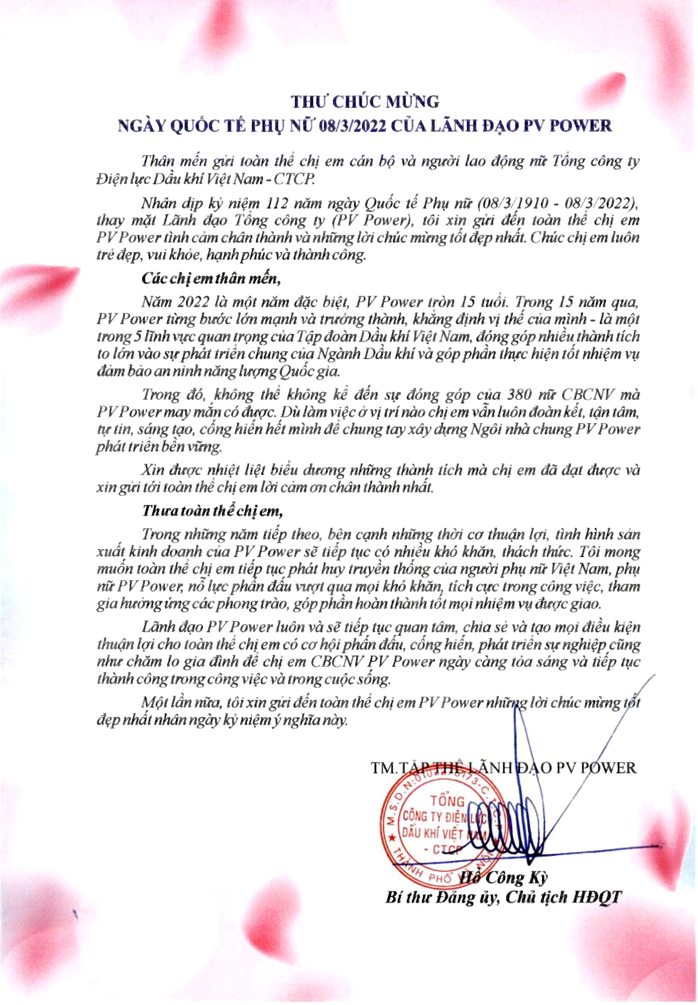 Thứ hai, 07/03/2022 | 16:56 Thư chúc mừng ngày quốc tế phụ nữ 08/3/2022 của Lãnh đạo PV Power Thư chúc mừng ngày quốc tế phụ nữ 08/3/2022 của Lãnh đạo PV Power ; Từ khóa: Hoạt động PV Power Đảng đoàn