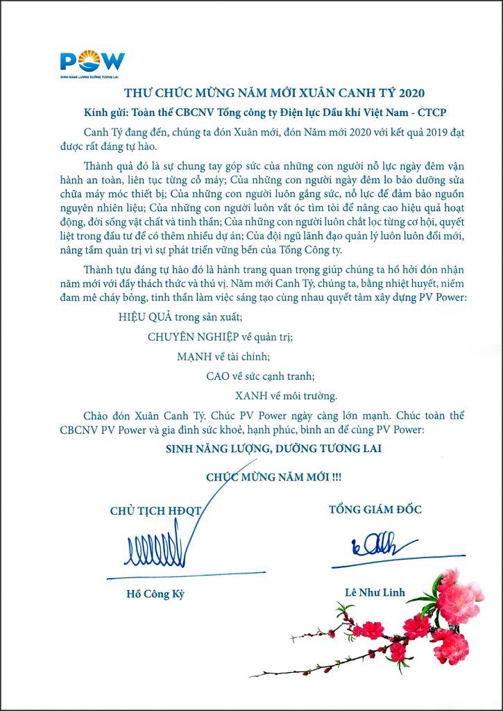 Thứ hai, 20/01/2020 | 15:31 Thư chúc Tết của Lãnh đạo gửi toàn thể CBCNV PV Power Thư chúc Tết của Lãnh đạo gửi toàn thể CBCNV PV Power ; Từ khóa: Hoạt động PV Power